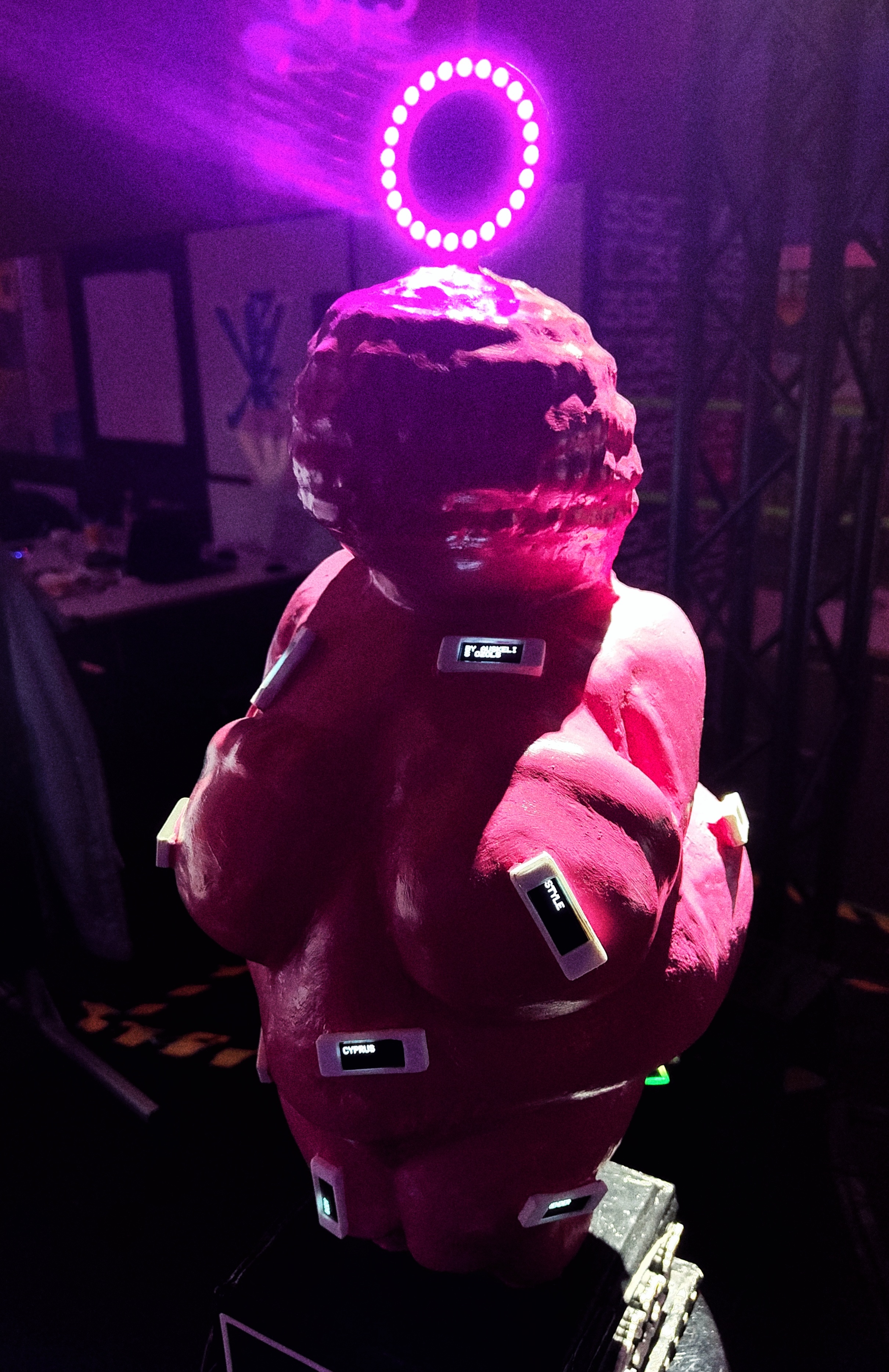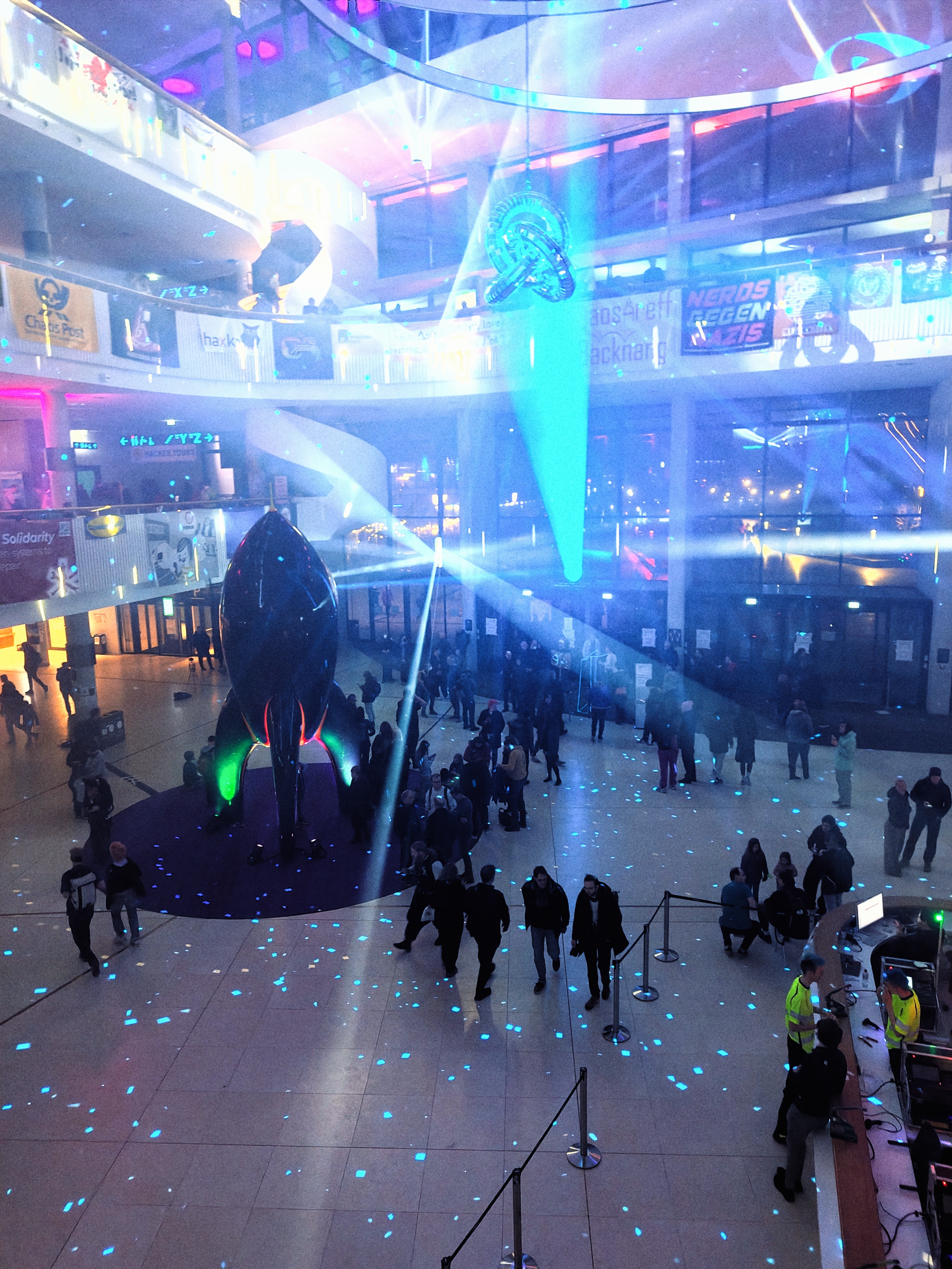 This is a space that's built on community. It has its own culture, its own deities (Cory Doctorow, Constanze Kurz, the concept of the RGB LED), demons (Amazon, The Government, AI?), and status symbols (3d printed cat ears, LED nametags).People come here with their local clubs and form clusters in dark exhibition halls, sitting around hacking things, programming, making art or just hanging out.