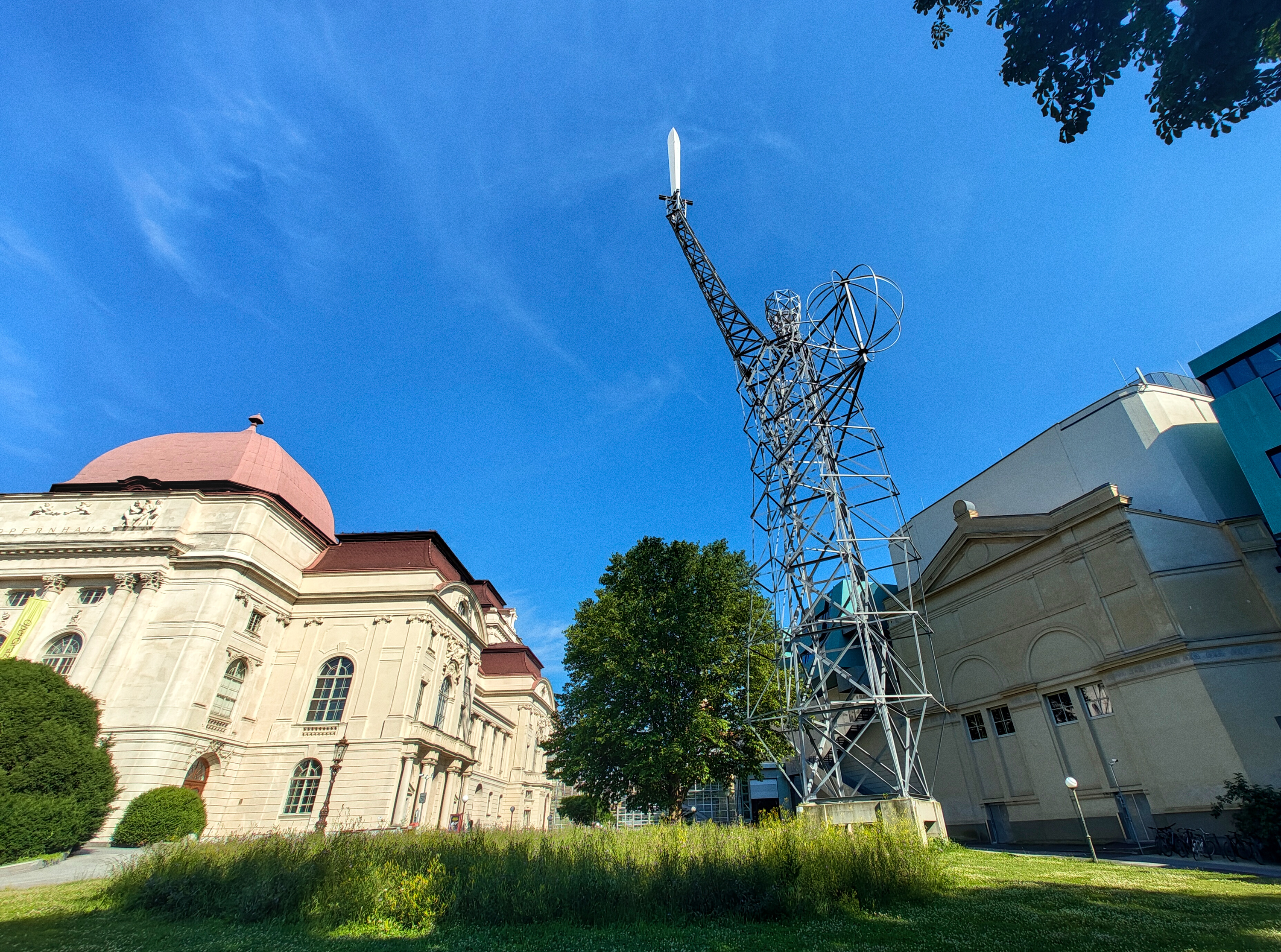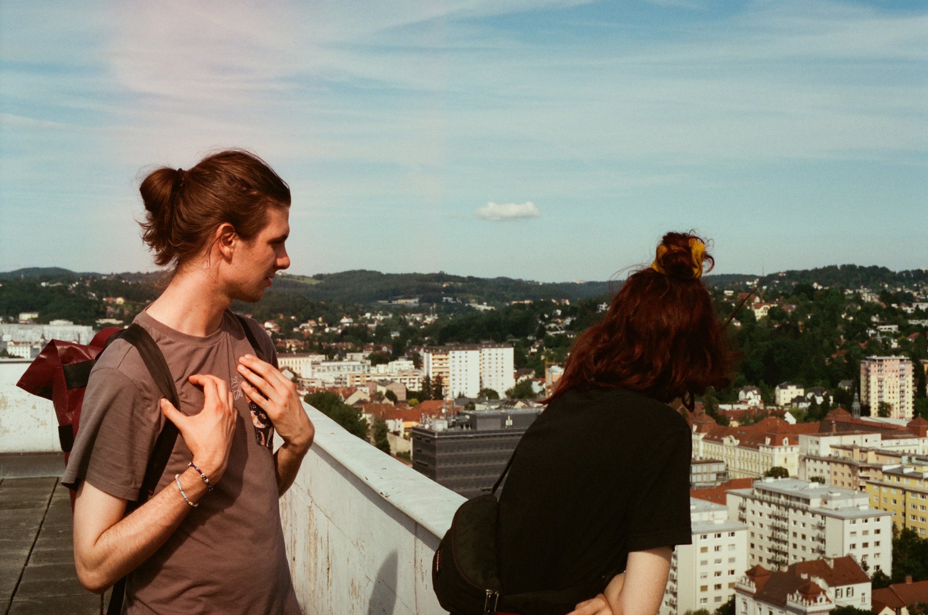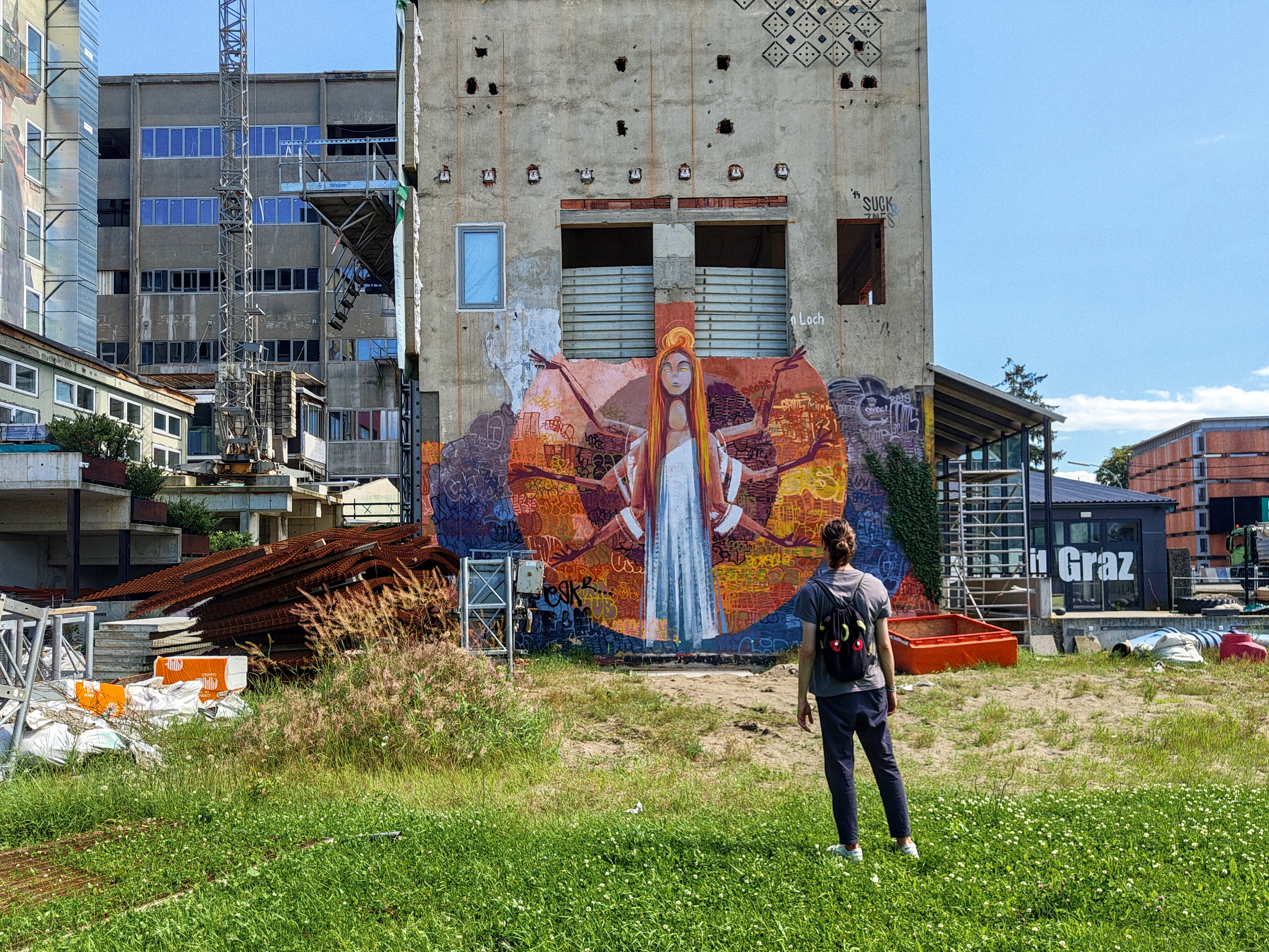 After lunch with Kerstin's parents, we need to re-assert our independence as rebellious teenagers and decide to hit the highs and lows this city has to offer: The highest point of Graz, if you're not being annoying about it, can't quite be called a skyscraper. But at 24 floors it's a pretty tall apartment building and really stands out among the lowdown cityscape. And if you know someone who used to live there, you might know how to linger around the front door, waiting to sneak in as people come and go. And you might even have a copy of the key that opens the door to the roof.