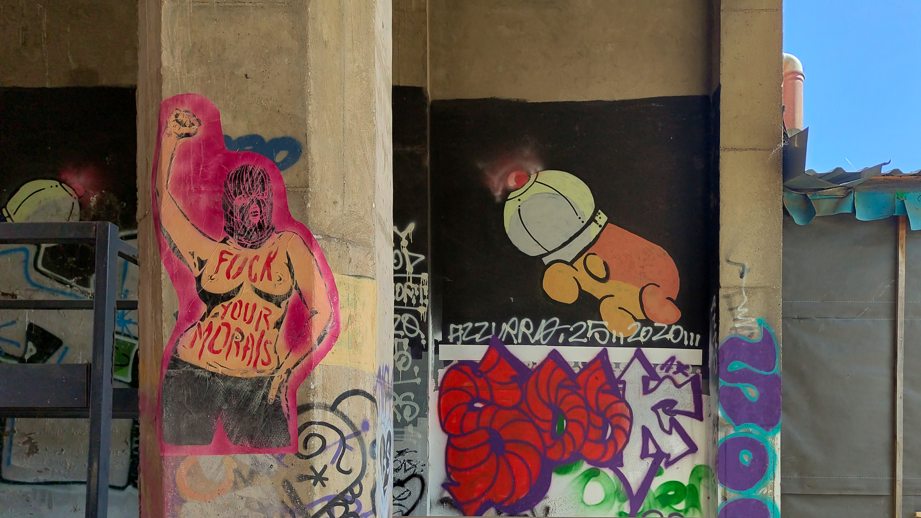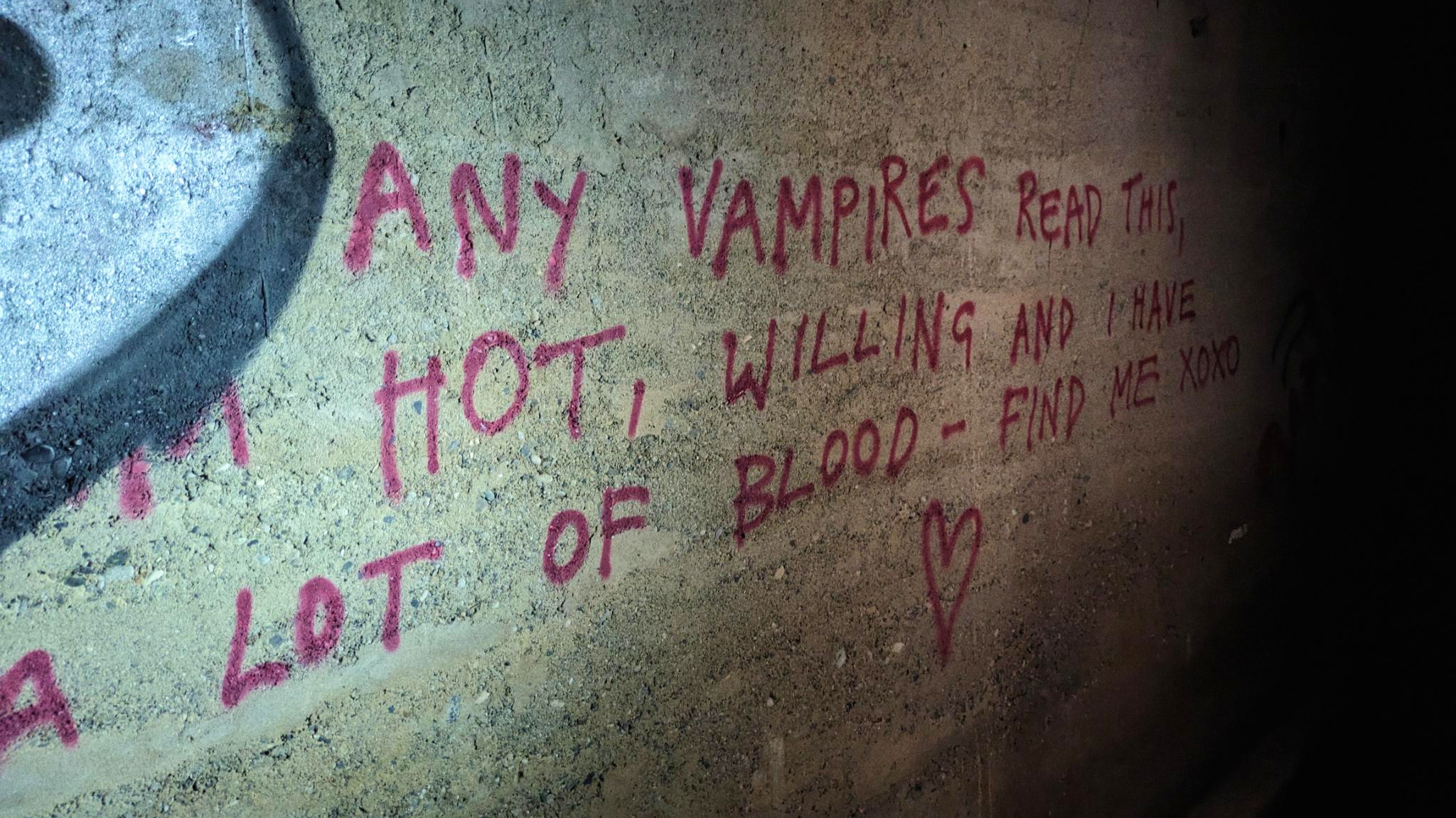 It's pitch dark. Our phone flashlights only do so much, but we do see the graffiti-covered walls as we pass by. There's not as much smell as we feared, but there's bits and pieces on the floor that you definitely don't want to step into. My shoes — my nice shoes! the only ones I brought! — feel uncomfortably dirty to say the least.But it's also really wild and exciting to walk through the city's guts like this — with all its pipes and chutes and rough stone walls — and to be completely alone in this darkness, together. We make it about halfway until we get to a bend in the tunnel where the water is not quite low enough, flowing over the path we've been walking on. Just the tiniest bit disappointed, we turn back and walk home through the park until the icky feeling on our shoes subsides.